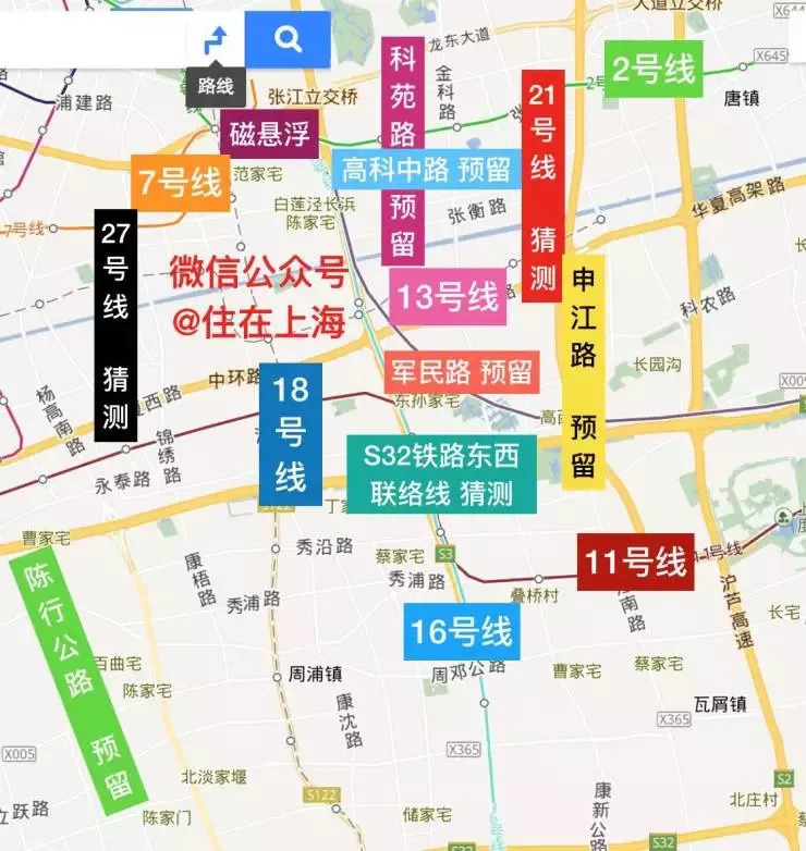 去年张江科学城规划出台以后,《住在上海》绘制的大张江未来15条轨交示意图重磅!官方首提上海轨交21号线、27号线、铁路联络线等9条全新轨交规划!真“宇宙中心”!大张江未来15条轨交经过!(需注意:下图含规划中5条控制预留轨道交通通道,以及4条全新线路猜测走向。其中张江军民路为今年3月起批复新建的道路,根据网上规划公示示意图画出,地图网站上目前还没有这条全新道路。)