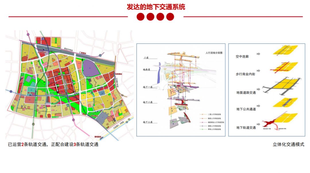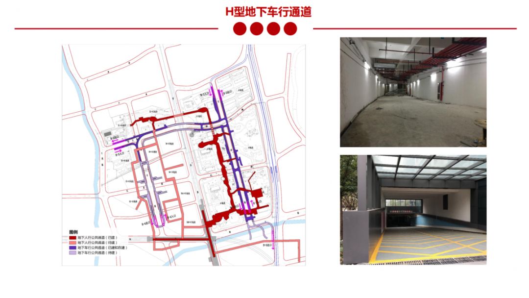 创新性规划地下H型车行公共通道,直连商业体地下车库,同时规划地下、地上多层次的步行交通体系,营造全天候、无障碍、高度智能化的综合交通体系,优化城市功能,提升城市品质。