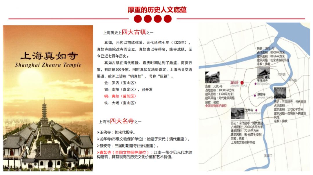 保护、延续和塑造地区文脉。主要包括:保护延续以真如古寺、真如古镇为代表的历史文化资源;延续发扬以真如羊肉、铜川水产为代表的美食文化资源;保护利用以银杏古树、真如港、梨园浜为代表的生态文化资源;创造利用上海西北地区特有的历史风貌与现代都市旅游文化融合的旅游资源。