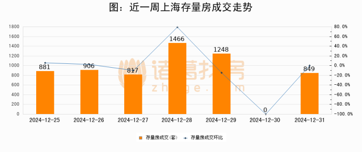 从存量房来看,2024年12月31日上海存量房单日成交849套,比昨日增加849套,环比上涨0%。从近一周存量房成交来看,上海存量房日均成交套数为881套,12月31日单日成交849套,低于近一周平均水平3.6%。
