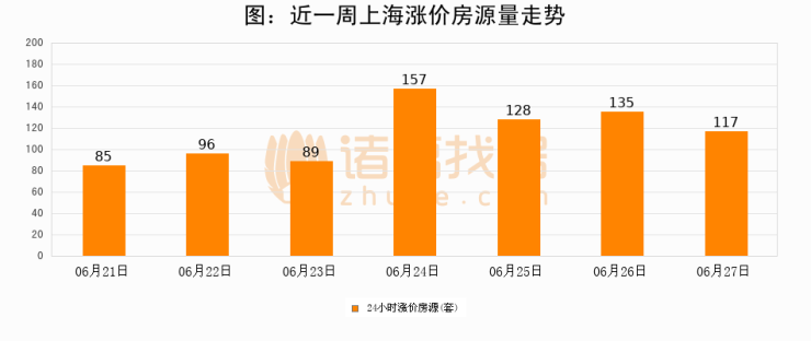 根据诸葛找房数据显示,上海24小时涨价房源量为117套,较06月26日减少18套,环比下降13.3%。与此同时,涨价房源占比小幅回落,对于购房者来说是一个入市窗口期,购房者可抓住时机入市。