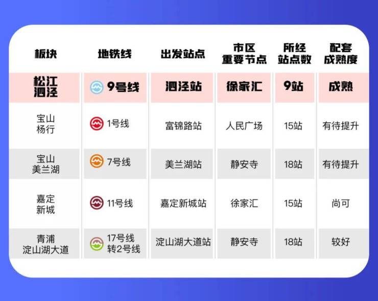 对于整个泗泾来说,9号线无疑是最重要的鎏金大动脉,同时也是这片区域的一张“王牌”,这条轨交为泗泾带来了“3站七宝,9站徐家汇”的巨大通勤优势,其通勤效率在全市各个轨交中都名列前茅。
