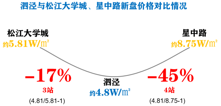目前来看,上海5W/㎡+新盘所在板块,与内环内CBD的地铁通勤时间大多数也都超过了40分钟。而泗泾站不仅是在通勤时间上更有优势,新盘价格上也同样更具高性价比。