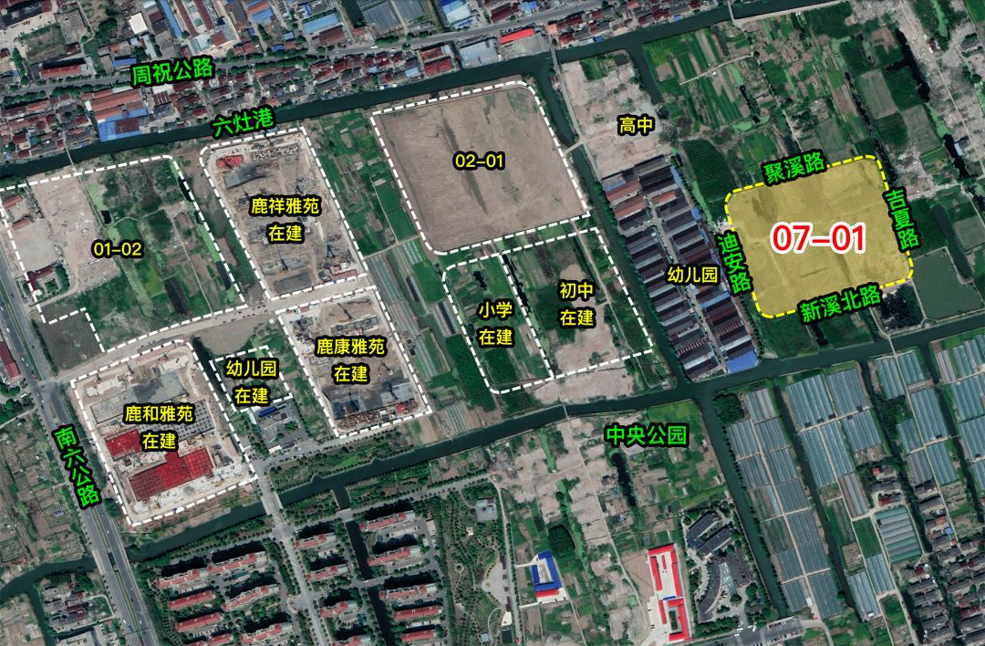 07-01地块东至吉夏路,南至新溪北路,西至Y1路,北至聚溪路,出让面积41412.5平方米,容积率1.7,出让年限70年,规划用途为动迁安置房,将新建9栋15层高层住宅,总户数900户。