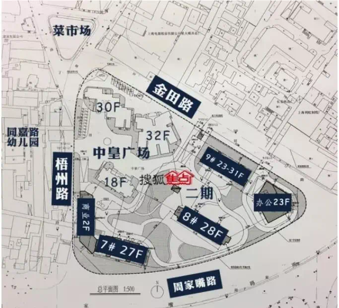 中皇广场位于梧州路、金田路、周家嘴路三条道路围合区域,为中嘉房地产开发,该地块属于商住办综合用地,一期二期总占地约20906㎡。中皇广场一期已建成3幢高层建筑,分别为18层、30层、32层。