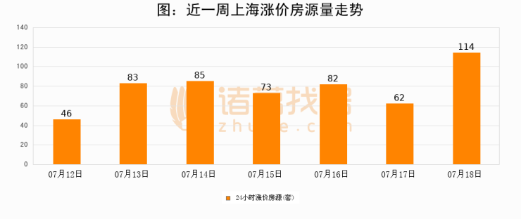 根据诸葛找房数据显示,上海24小时涨价房源量为114套,较07月17日增加52套,环比上涨83.9%。与此同时,涨价房源占比小幅扩大,业主信心有所提升。