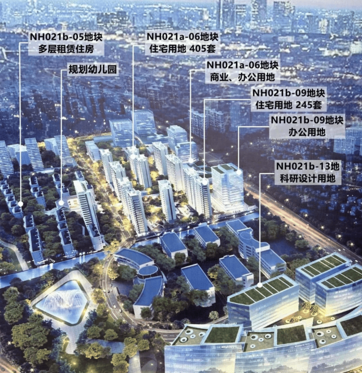 地块出让面积157921㎡,为混合用地,NH021b-05地块租赁住房,NH021b-09地块普通商品房、办公楼,NH021a-06地块商业用地、办公楼、普通商品房,NH021b-13地块科研设计用地。