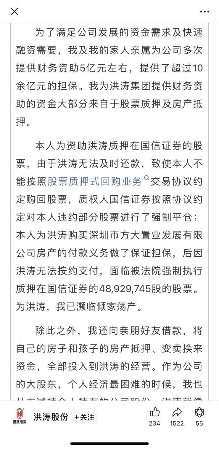 刘年新在公开信中写道:“为了满足公司发展的资金需求及快速融资需要,我及我的家人亲属为公司多次提供财务资助5亿元左右,提供了超过10余亿元的担保。我为洪涛集团提供财务资助的资金大部分来自于股票质押及房产抵押。”