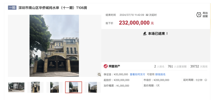 7月10日,阿里拍卖平台显示,位于深圳市南山区华侨城纯水岸(十一期)的一栋别墅法拍房以2.32亿元的价格成交,刷新了深圳单套法拍房的成交记录。该套法拍房的建筑面积463.91平方米,折合成交单价每平方米超过50万元。