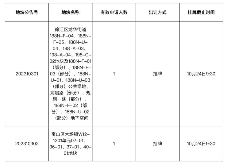 另外,经审核,徐汇区龙华街道188N-F-04、188N-F-05、188N-U-04、198-A-03、198-A-04、198-C-02地块及188N-F-01(部分)、188N-F-03(部分)、188N-U-01、188N-U-03(部分)公共绿地、龙启路(部分)、规划一路(部分)、188N-F-02(部分)、188N-U-02(部分)地下空间(202310301)、宝山区大场镇W12-1301单元07-01、36-01、37-01、40-01地块(202310302)确定采用挂牌方式出让,具体地块后续出让活动时间进度安排表如下: