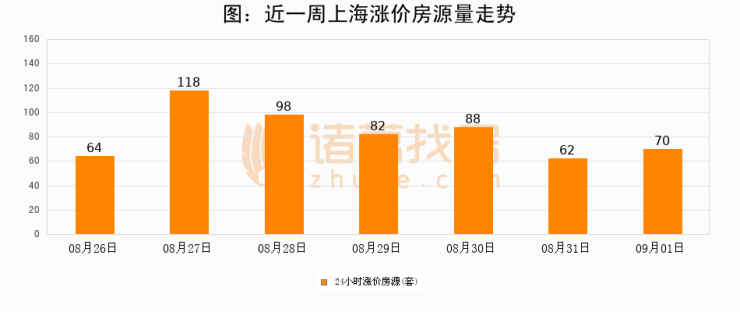 根据诸葛找房数据显示,上海24小时涨价房源量为70套,较08月31日增加8套,环比上涨12.9%。与此同时,涨价房源占比小幅扩大,业主信心有所提升。