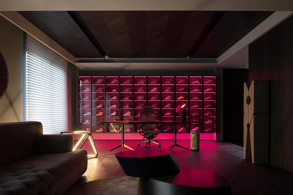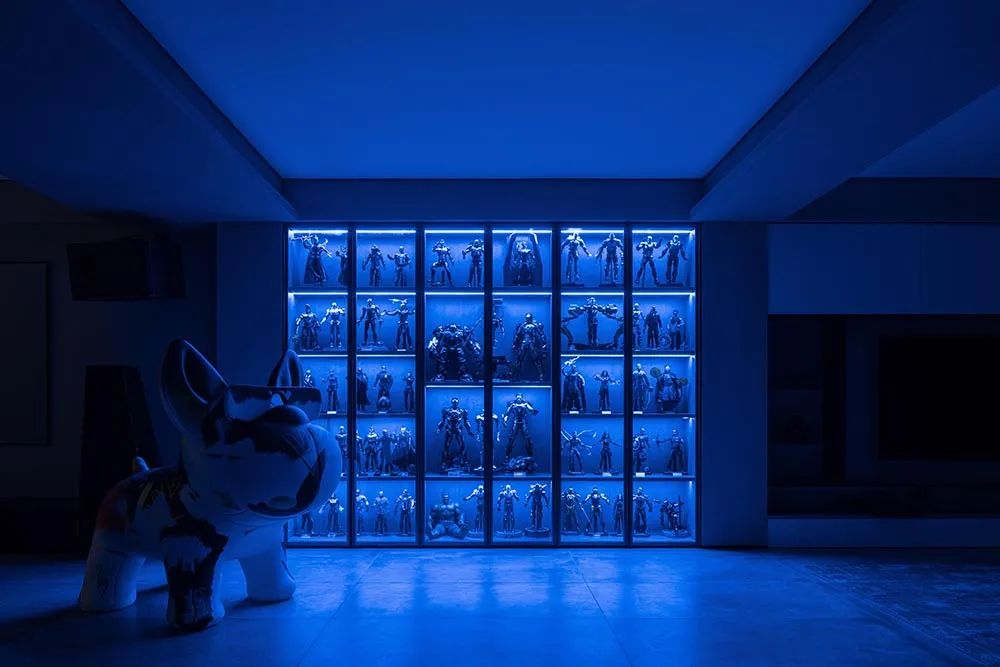 把这种个性与设计结合到一起,成为了大强非常喜欢的一套案例《星河入梦》。运用了赛博朋克的风格,装进了男业主喜欢的改装车、高达手办,女主人热爱的限量版鞋子,一起做成展架,大大方方的show出90后业主的朝气与个性。当我们看到一整面墙的展示柜,里面陈列着大大小小、从国外淘回来的精致手办,配上激光灯不停变幻的色彩,谁见了都忍不住赞一声:太酷了,这就是年轻的设计和年轻人的生活啊。