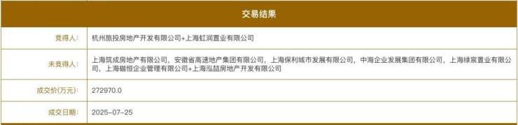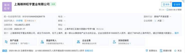 竞得者为上海祺祥旺宇置业有限公司,公司成立于2025年1月17日,法定代表人为叶舒祺,目前企业状态为存续,注册资本为155000万元。相当于准备了溢价55%的资金来拿地,势在必得。