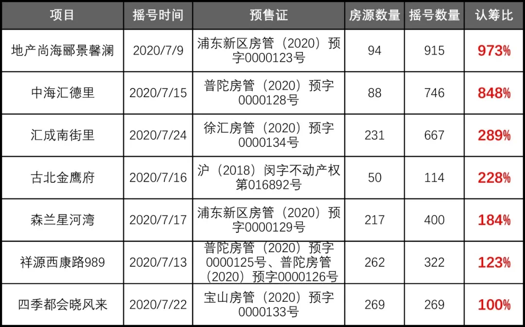 表:7月上海7盘认筹率过百