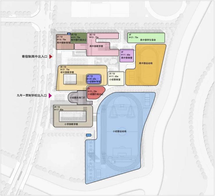 高中从北侧入口广场进入,沿着东西向轴线依次布置体育馆、阅览室、教室、食堂、学生宿舍等功能用房。