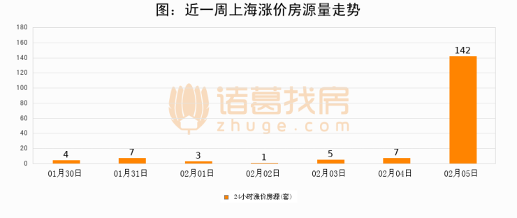 根据诸葛找房数据显示,上海24小时涨价房源量为142套,较02月04日增加135套,环比上涨1928.6%。与此同时,涨价房源占比小幅扩大,业主信心有所提升。