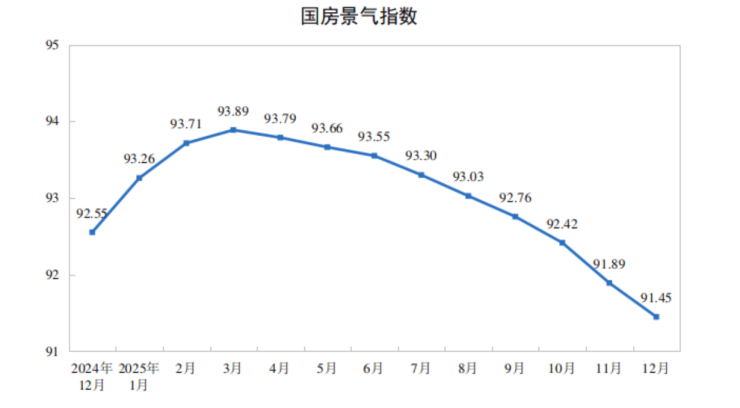2025年12月份,房地产开发景气指数(简称“国房景气指数”)为91.45。