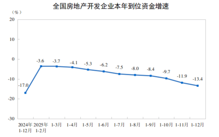 2025年,房地产开发企业到位资金93117亿元,比上年下降13.4%。其中,国内贷款14094亿元,下降7.3%;利用外资25亿元,下降20.8%;自筹资金33149亿元,下降12.2%;定金及预收款28089亿元,下降16.2%;个人按揭贷款12852亿元,下降17.8%。