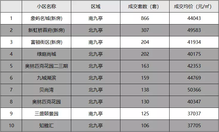 数据来源:兔博士APP,时间点是2018年1月1日至2019年8月6日从2018年开始,整个九亭的楼市成交排名前3的是三个一手房项目,其中新虹桥首府位于北九亭,成交价在49000元/㎡左右,比排名前列的象屿名城和第三的富顿街区贵上不少。
