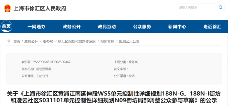 近日,上海徐汇区黄浦江南延伸段WS5单元控制性详细规划188N-G、188N-I街坊局部调整草案公示。