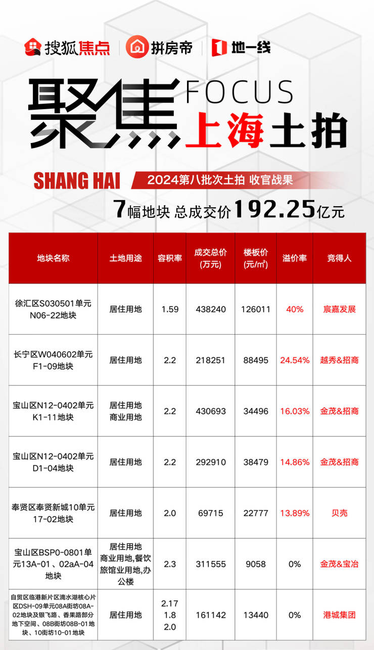 2024年上海八批次土拍今日结束,7宗地块全部成功出让,总出让建面75.49万㎡,总土地出让金额192.25亿,成交楼面均价25468元/㎡,2宗地块底价成交,5宗溢价成交,其中徐汇龙华地块触发中止价,装标竞到7000元/㎡,配套公建竞到1840㎡,最终由宸嘉竞得,楼面均价12.6万/㎡,溢价率40%,是继浦东新区新杨思地块以来第二个触发“双高双竞”中止价的地块。