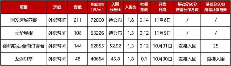 结合触发积分项目,新政后已有4盘触发积分,全部位于外郊环间。其中闵行浦锦街道大华星樾为第二次触发积分,首开推143套房源全部售罄,认购率达到212%,触发积分57.68;新政后加推108套房源认购率达到273%,再次触发积分。位于奉贤新城的龙湖观萃,认购首日便确定触发积分,最新公布入围分46.80分。
