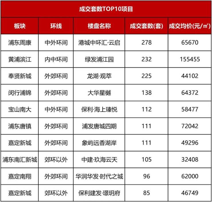 具体到单个项目上,成交套数TOP10项目中,除了港城中环汇·云启、绿发浦江园、保利·海上瑧悦3个项目,其他7个项目均位于外环外。