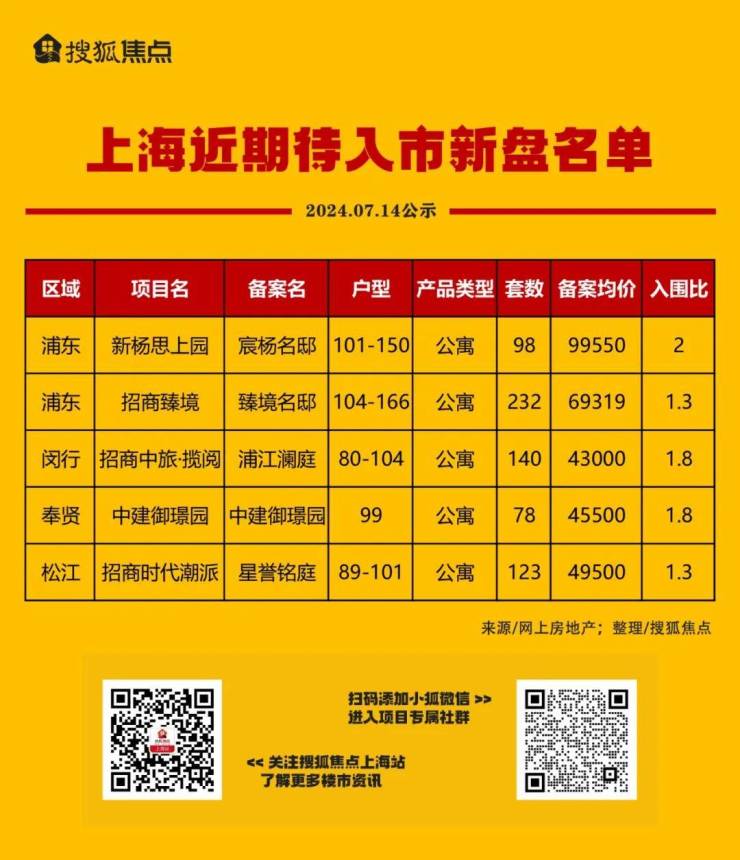 7月14日,网上房地产公示一批待入市新盘:5个项目共671套房源,分别位于浦东、闵行、奉贤、松江区域。