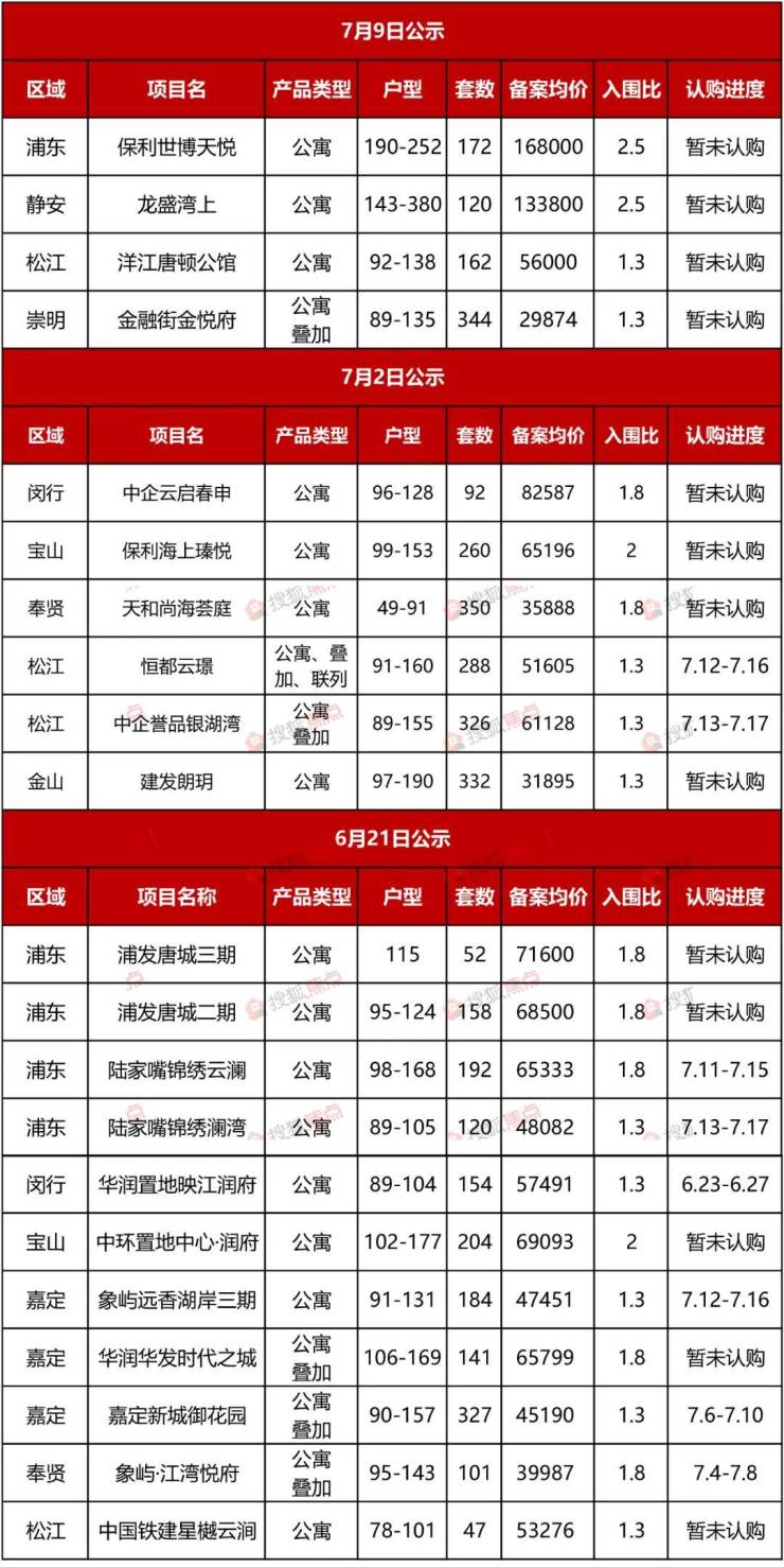 取消批次集中供应之后,自6月21日以来已先后公示4次,上海新房供应明显呈现出“少量多次”趋势。6月21日-7月9日公示的21盘共有8个项目已公示认购。