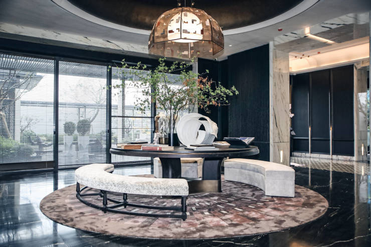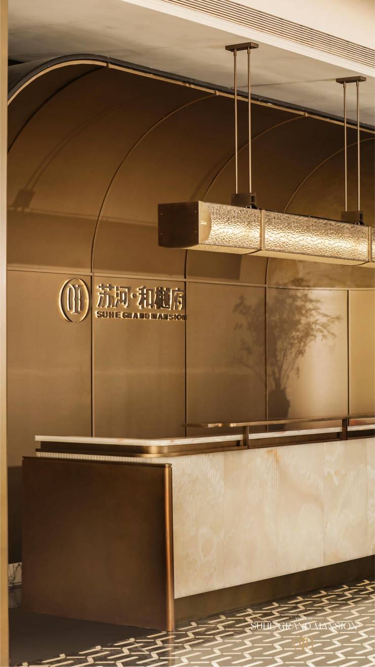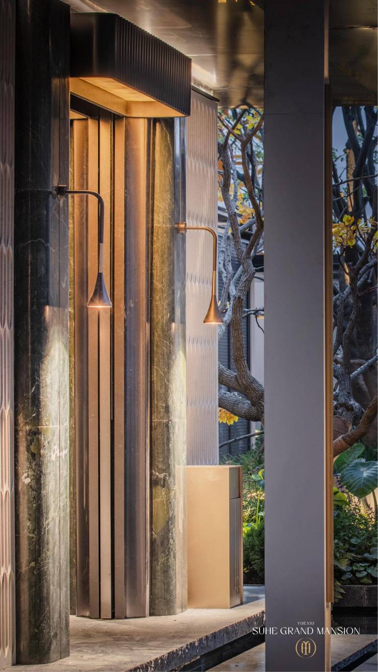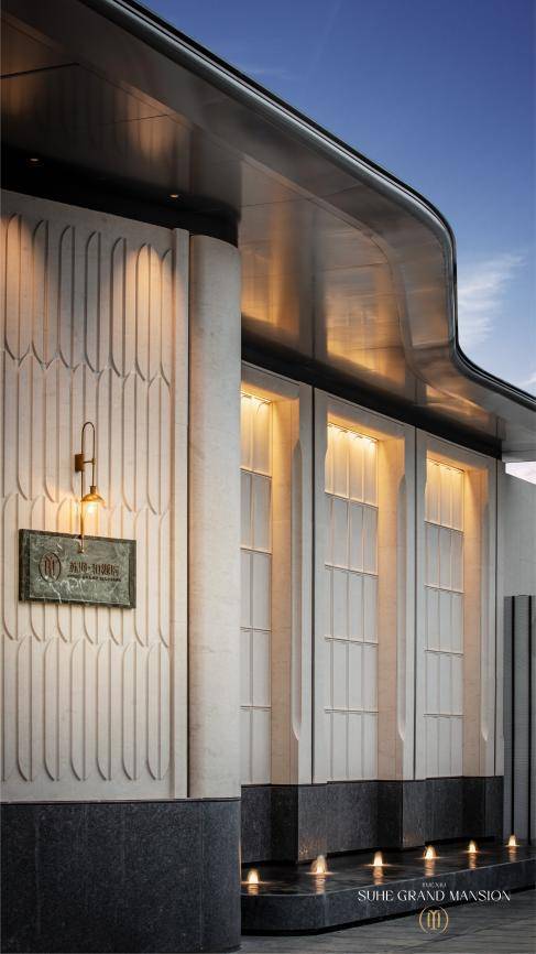 自然主义奢宅和樾府,读懂苏河的文脉、绿脉,以非遗锻鏨手法打造10米铜门,以匠心的手笔来续写百年苏河的历久弥新。以自然的美国白金花岗岩打造立面,以维纳多自然石材来呼应苏河的勃勃生机。同时因地制宜,将和樾府logo融入玉兰元素,彰显摩登的城市文化。
