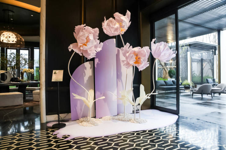示范区现场和樾府与高端纸艺美学品牌「森森纸艺」联名,展出系列高定永生花艺作品,其美学理念与和樾府自然主义匠心作品完美契合。多款造型高雅的花艺,陈列于实景示范区空间内,打破花艺与空间美学的创作边界,以自然主义理念,重塑艺术生命力,传递出时光的永固之美。