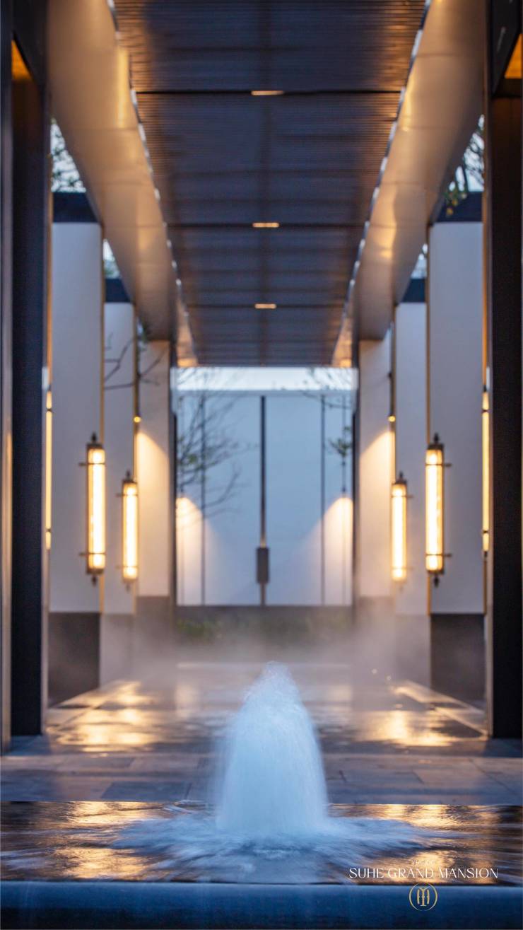 第二进·和光,约20m长的梁桥浮水,营造出幽深绵长的唯美场景。阵列柱廊有迎宾之意,两侧特选乌桕将自然与光影完美诠释,漫步其中,好似走过苏州河的悠悠岁月。