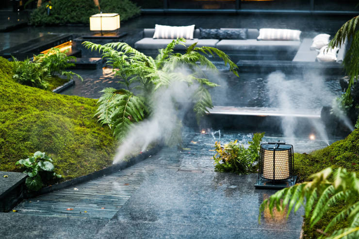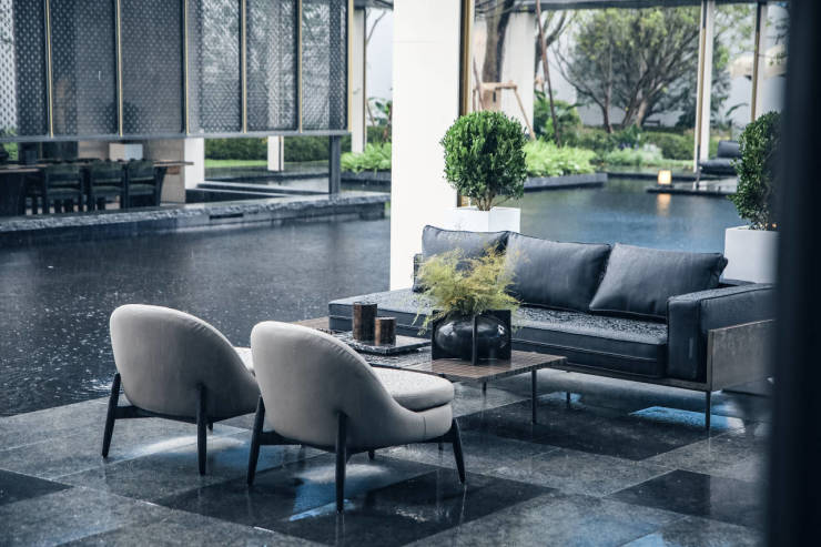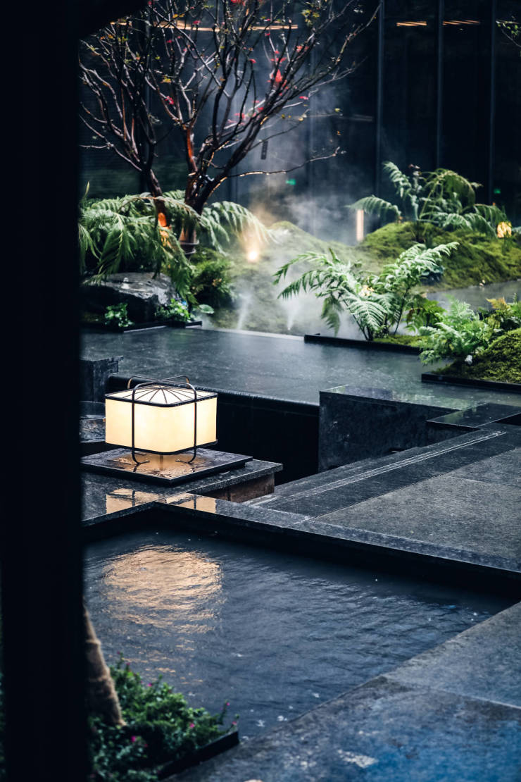 第三进·思源,中央位置为太湖原石,水从采用纯手工打造的金属出水口中涓涓流出,是现代工艺与自然肌理的碰撞,营造鸣水为歌的静雅氛围。