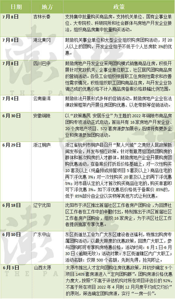 据澎湃新闻不完全统计,6月以来,至少包括山西太原、广东中山、辽宁沈阳、浙江桐庐、安徽铜陵、云南普洱、四川巴中、湖北黄冈、吉林长春等地发布“购房团购”相关政策或活动。以吉林长春为例,今年7月8日,吉林省长春市政府办公厅发布《进一步促进房地产市场平稳发展若干措施的通知》,《通知》提到,支持集中批量购买商品房。支持机关单位、国有企事业单位、大专院校、科研院所和社会群体与房地产开发企业接洽,组织商品房集中批量购买活动。团购房需取得商品房预售许可,房地产开发企业不得低于成本价格销售。