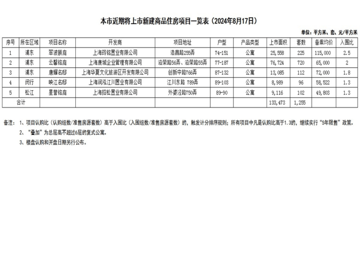 8月17日,网上房地产官宣上海近期即将上市新盘。本次共计5盘过会,分布于浦东、闵行和松江,共计1255套房源。