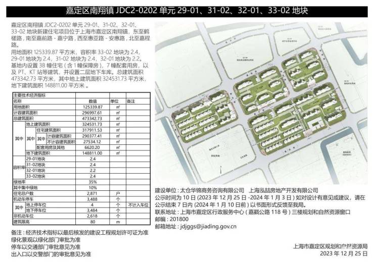 嘉定区南翔镇JDC2-0202单元29-01、31-02、32-01、33-02地块新建住宅项目,用地面积125339.87平方米;容积率33-02地块为2.4、29-01地块为2.4、31-02地块为2.4、32-01地块为2.2。