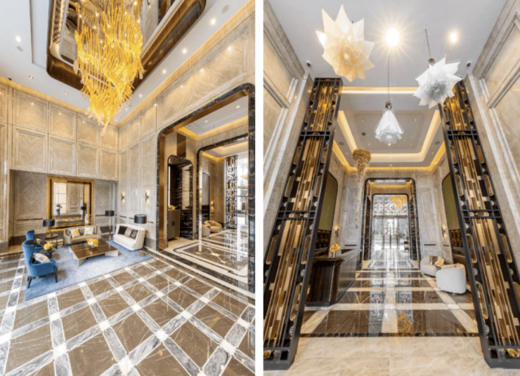 布局注重对称之美,白色典雅的墙身设计和意大利名贵黑白相间的大理石地板,犹如欧洲贵族宫廷的入口地板图案,无一不透露着矜贵的设计语言与独到的艺术品味。