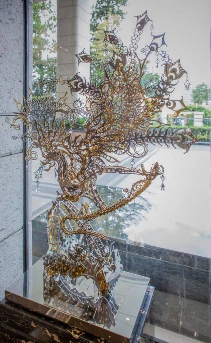 最为吸睛的是上方悬挂着近2米高Lasvit名贵琥珀色花瓣状大型水晶灯,纯手工打造,带出独一无二的线条及流动感的设计。席时斌所创作的1.75米高的“至高鸟”,凤凰展翅,寓意吉祥。还有Cynthia Sah萨璨如的雕塑作品,采用卡拉拉大理石雕琢而成。