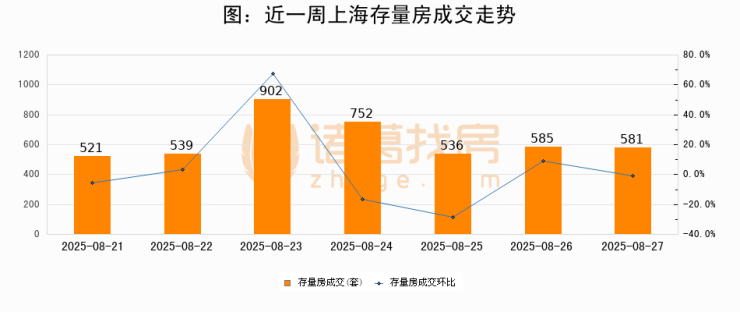 从存量房来看,2025年08月27日上海存量房单日成交581套,比昨日减少4套,环比下降0.7%。从近一周存量房成交来看,上海存量房日均成交套数为630套,08月27日单日成交581套,低于近一周平均水平7.8%。