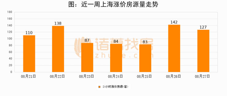 根据诸葛找房数据显示,上海24小时涨价房源量为127套,较08月26日减少15套,环比下降10.6%。与此同时,涨价房源占比小幅回落,对于购房者来说是一个入市窗口期,购房者可抓住时机入市。
