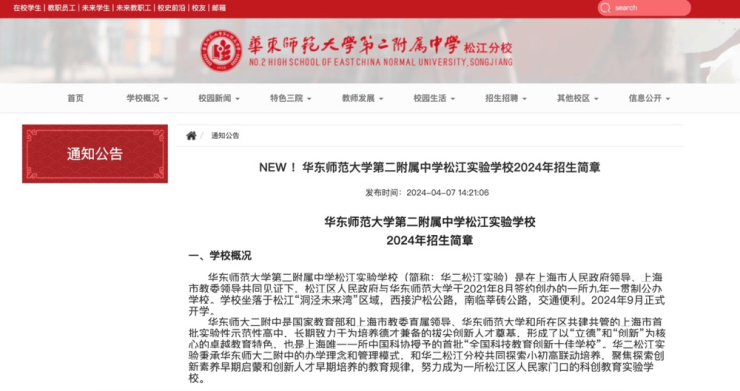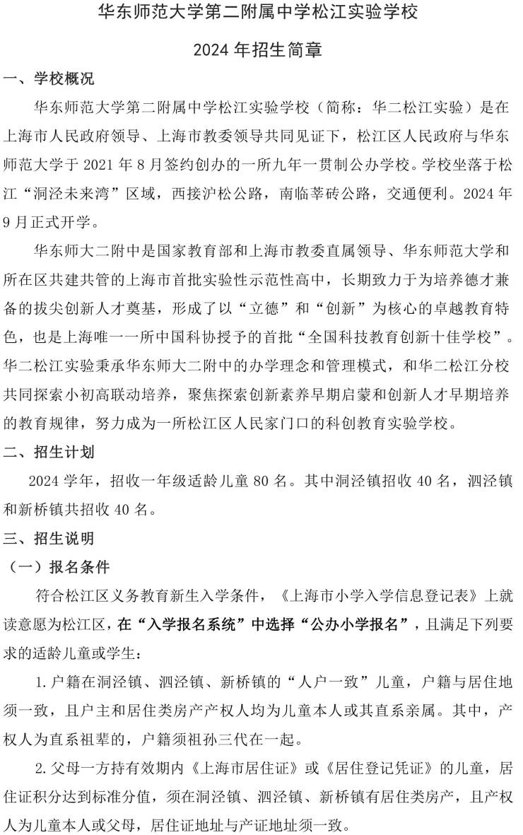 4月7日,2024年松江区公办小学、初中对口范围已公布。其中备受家长关注的华东师范大学第二附属中学松江实验学校在其学校官网发布了首届招生简章。2024学年,招收一年级适龄儿童80名。其中洞泾镇招收40名,泗泾镇和新桥镇共招收40名。人户一致或者有居住证积分均可报名,电脑摇号录取。