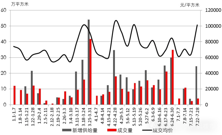 虽然上周均价再度冲上10万元/平方米表现抢眼,但通常这种数据背后是刚需以及首次改善产品成交乏力导致。连续两周成交都没有超过10万平方米已经说明问题。上周供应虽然回归,但要反应到成交数据上仍需要一些时间,所以7月的交易数据会比较难看。市场疲软的背后有多种原因,既有淡季因素也有政策短期效应削弱。因此未来一段时间成交即便有反弹,更可能是脉冲式上行。