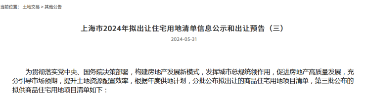 5月31日,上海土地市场官网发布三批次拟出让住宅用地清单信息公示和出让预告,三批次地块分布于杨浦、宝山、奉贤,总计出让面积15.29公顷,全部为挂牌出让。拟于6月上旬发布本批次住宅用地出让公告,7月上旬开始组织交易活动。
