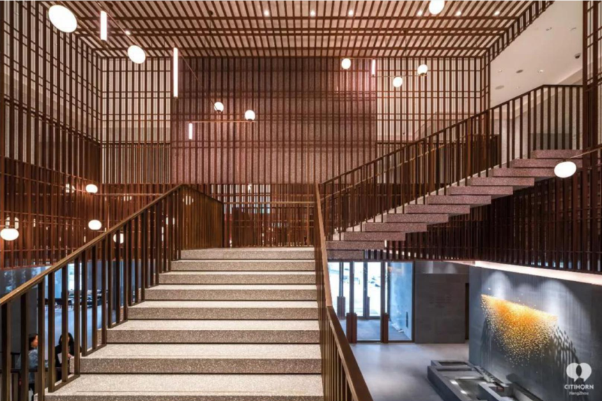 图:上海素凯泰顶奢酒店用万石集高定石做出来的悬空楼梯成了网红