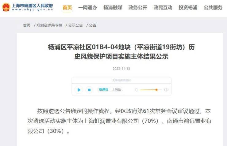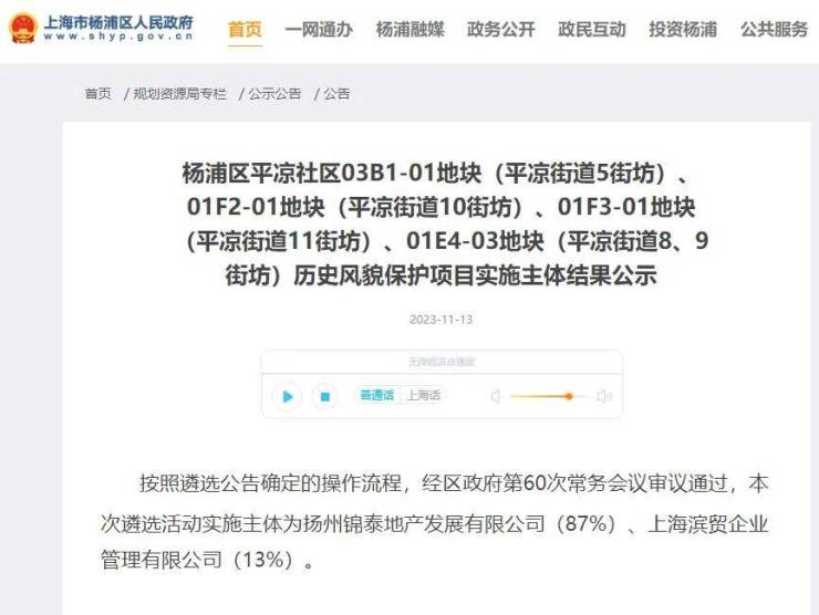 11月13日,根据杨浦区人民政府官网显示,平凉社区两个历史风貌保护项目公布遴选结果。