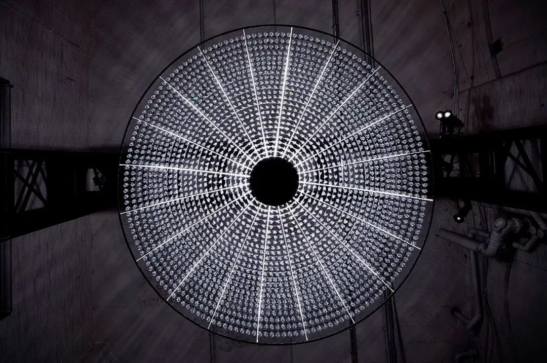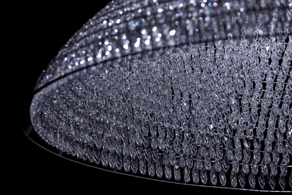 这个华盖般的穹顶悬挂着成千上万个独立的施华洛世奇冰川形仿水晶,当一阵微风拂过,这些晶体轻轻摇摆,下方浮动的圆盘将光源透过冰川形的切面不断折射,营造出穿越时空般戏剧化的动态一幕。
