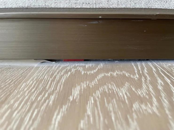 此外有业主爆料,主卧地板和踢脚线有一个超大缝隙,地板缝还能看见一些建筑垃圾留在里面,正所谓“败絮其内”。
