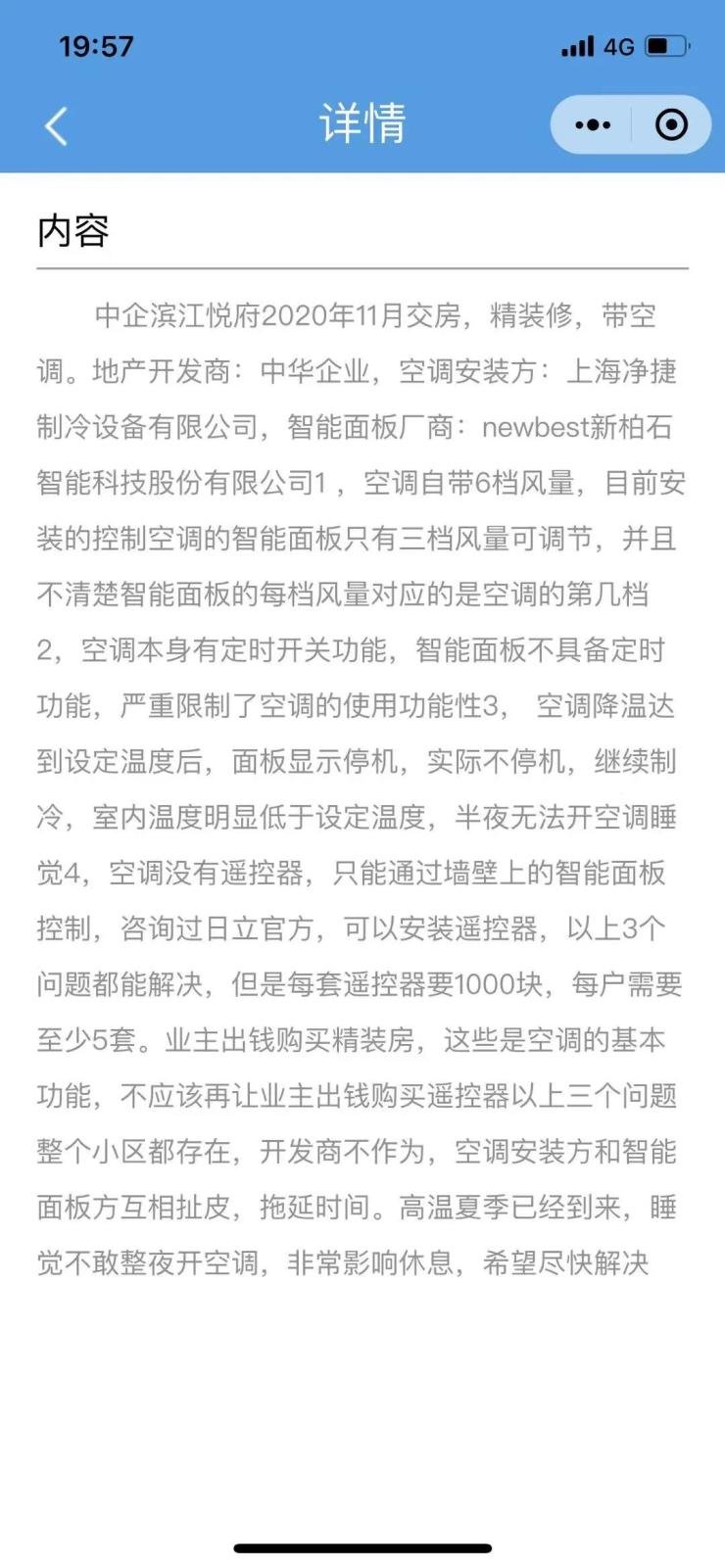 空调售后表示以上问题可以通过购买遥控器来解决,但是每套遥控器要1000元,每户至少需要5套。开发商对上述问题不作为,原本开发商所需要承担的费用却要转嫁至业主买单。
