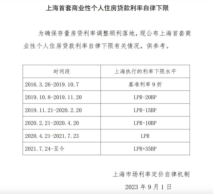 9月1日中午12时许,中国人民银行上海总部官网公布上海首套商业性个人住房贷款利率自律下限,其中,2021年7月24日-至今上海执行的利率下限水平为LPR+35BP。附件如下: