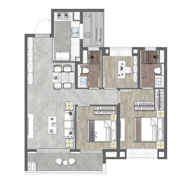 客餐厅相连,客厅+次卧南接超大尺度阳台,室内空间尺度感十足,整个采光面拉到极致。